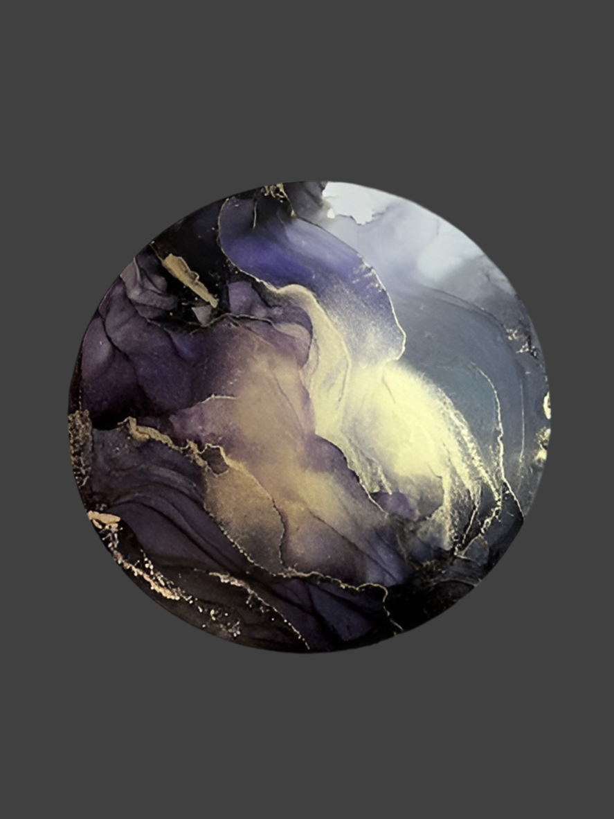 Contemporary art featuring purple, grey and gold. A vision of surreal abstract birds flying into an atmospheric storm. Symbolic of a portal where Psyche travels to the underworld on a quest for love.